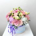 Пионы, розы и эустомы в коробке
