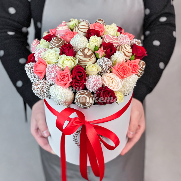 30 ягод клубники и розы в коробке