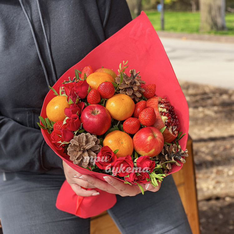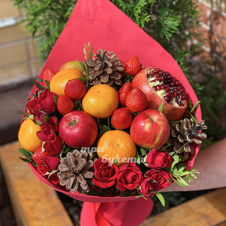 Букет из клубники, фруктов и шишек