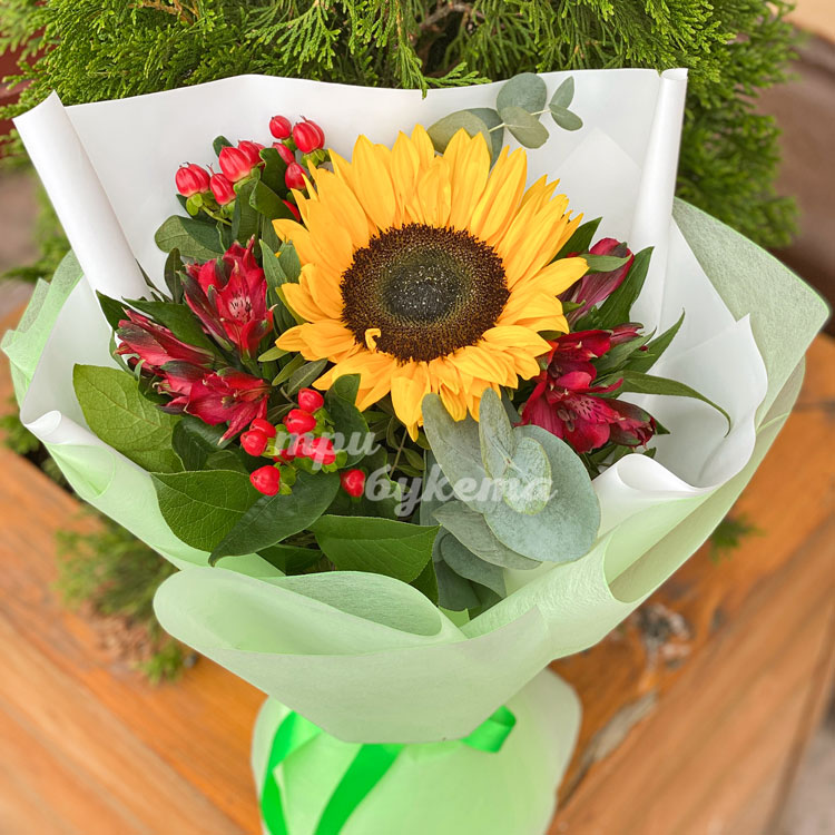 Букет из красных альстромерий с подсолнухом