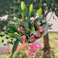 Букет розовых роз и сиреневых хризантем