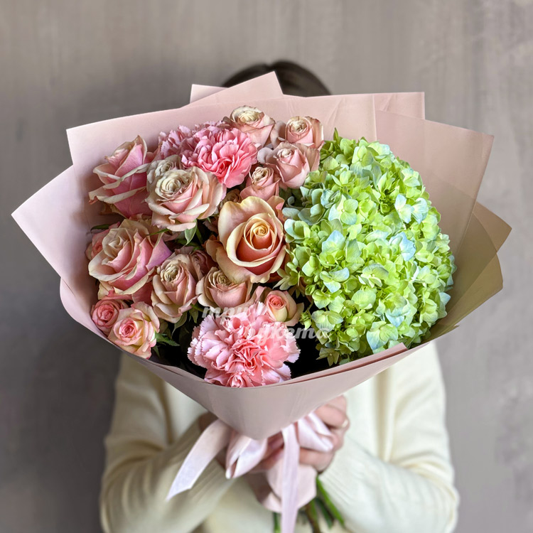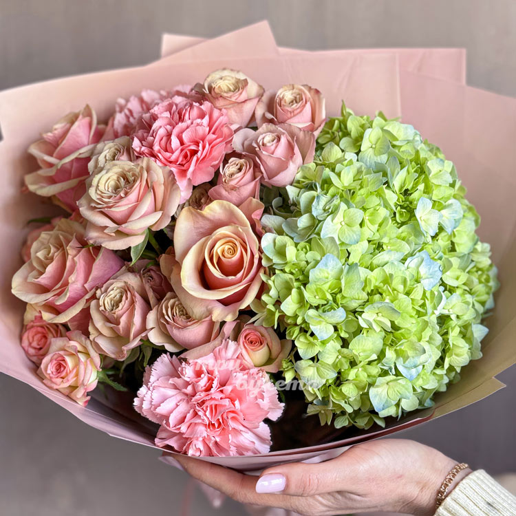 Букет розовых роз с зеленой гортензией