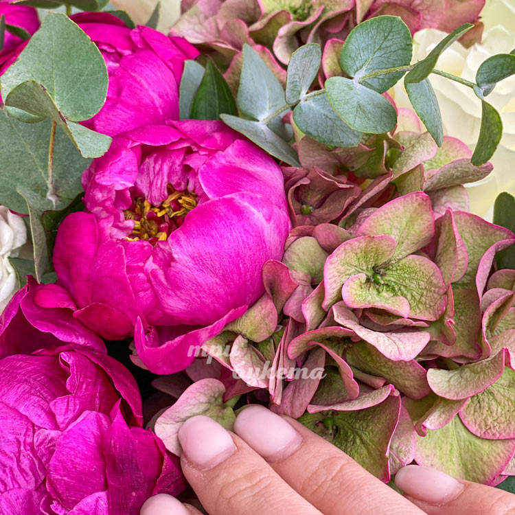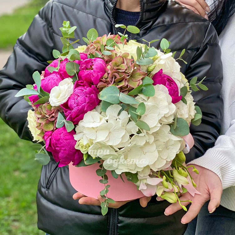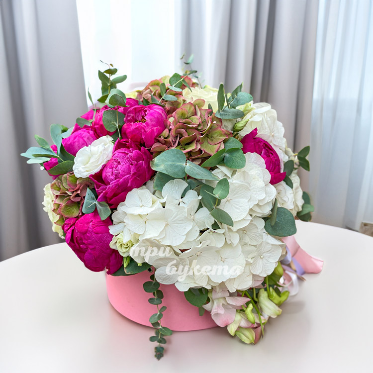 Коробка гортензий, пионов и эвкалипта