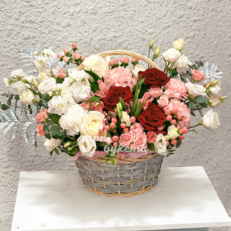 Корзина из гвоздик, роз и маттиол