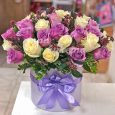 Корзина розовых кустовых роз с гиперикумом