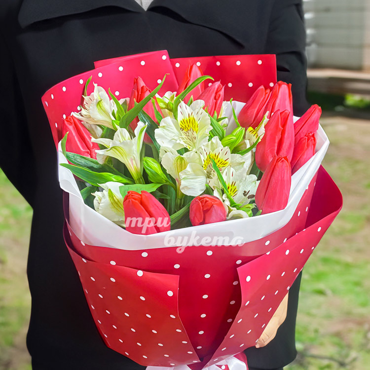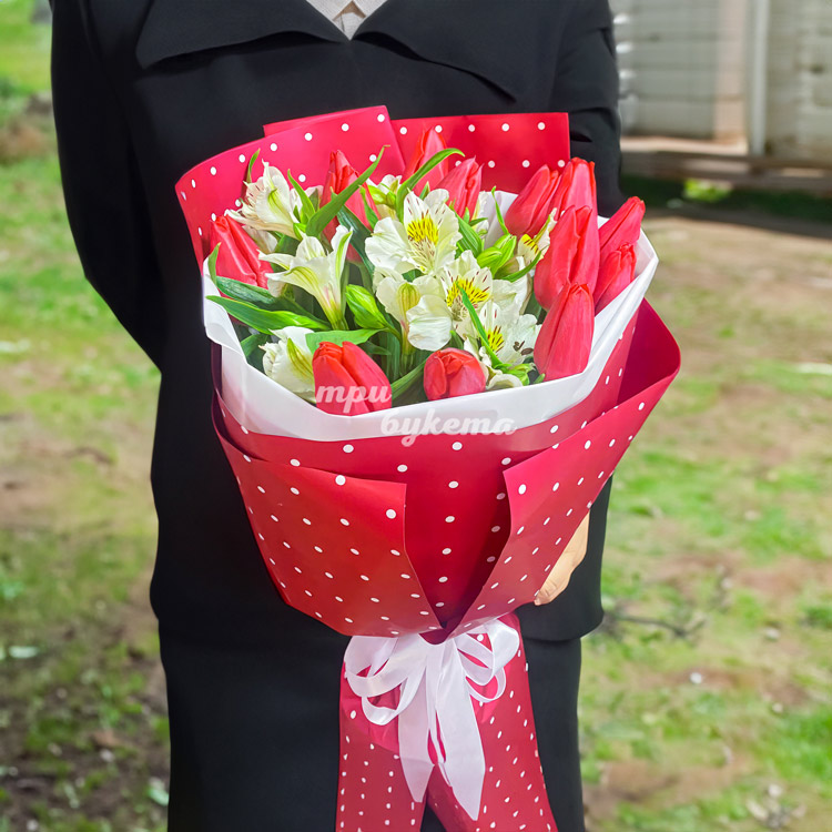 Красный букет тюльпанов и альстромерий
